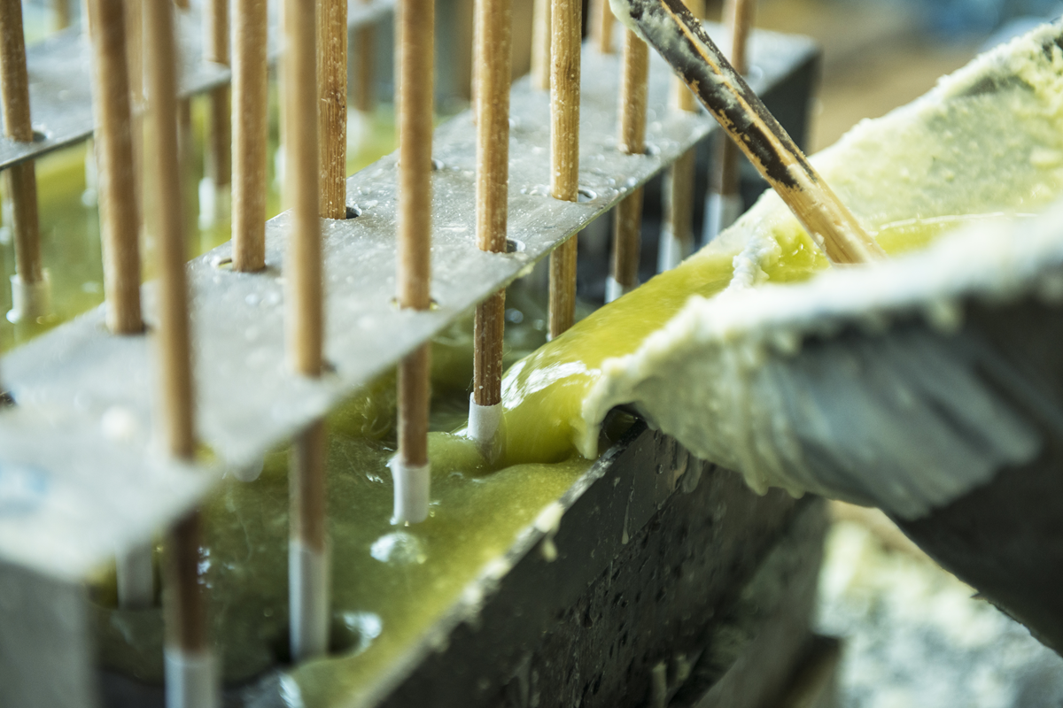 櫨(はぜ)の実や菜種などの植物性の蝋、和紙と灯芯草でつくられた芯。