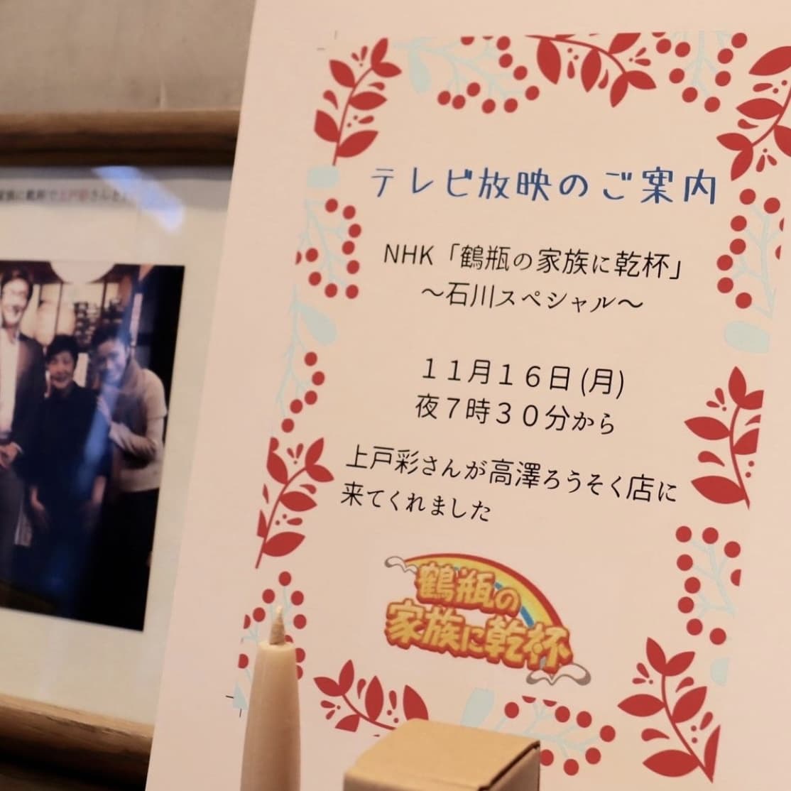 今回の石川スペシャルでは石川県での名場面をお届け。 7年前に上戸彩さんが高澤ろうそく店を訪れてくれたときの様子が再放送されるそうです。