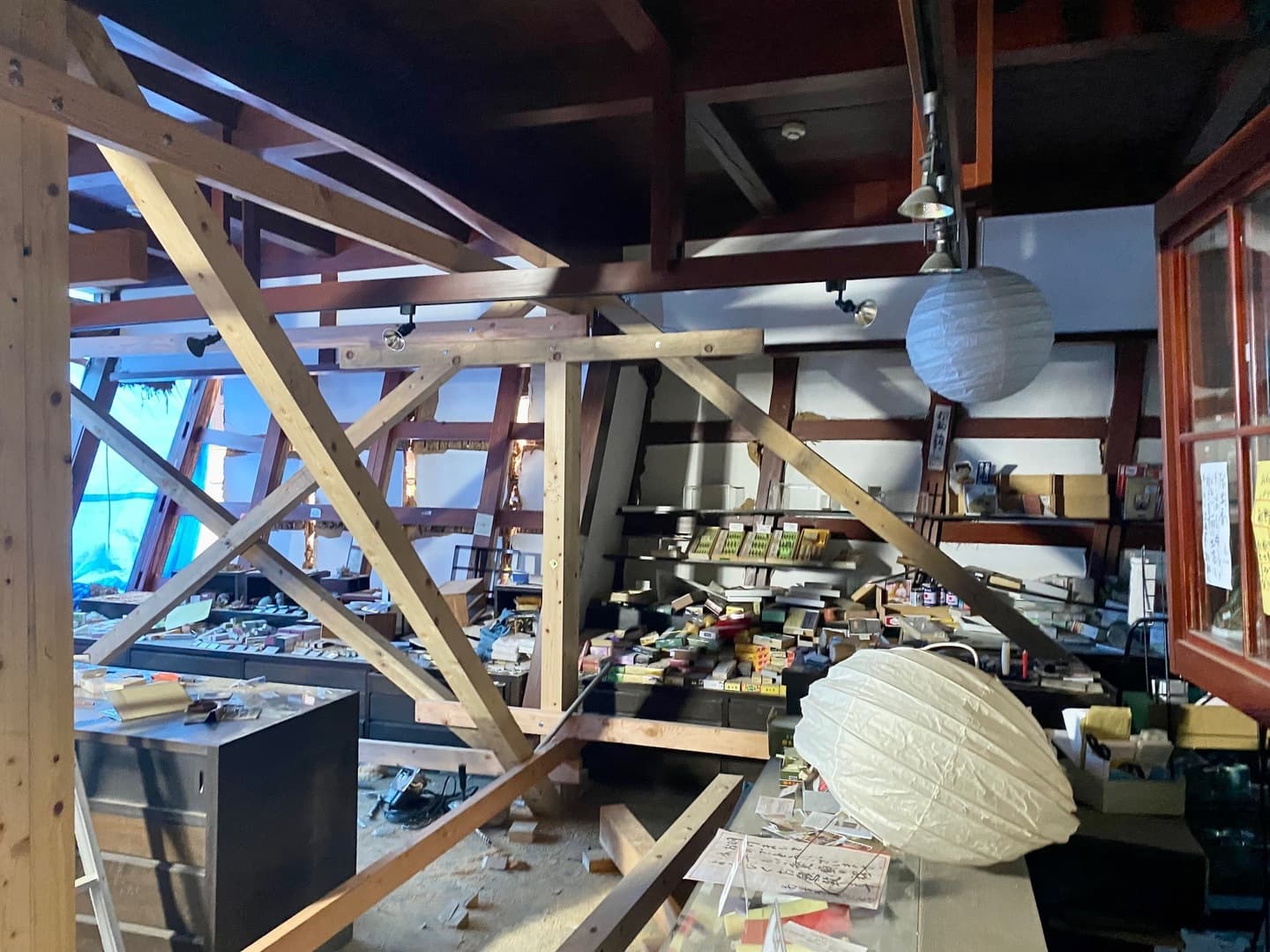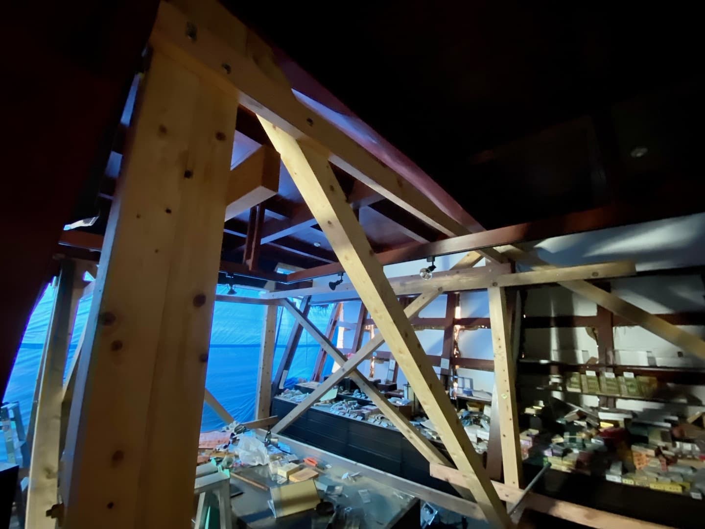 写真は地震発生直後に行った、建物内部の木材による補強です。