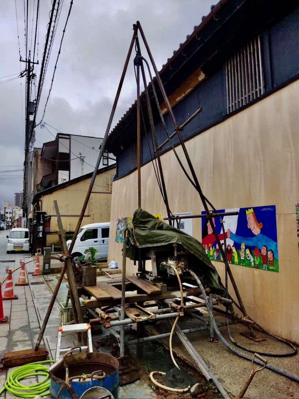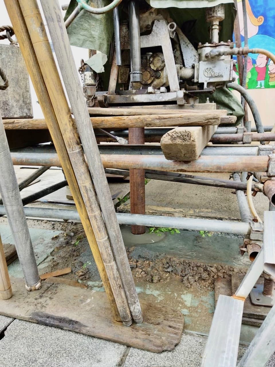 写真は地盤改良を行うためのボーリング調査です。