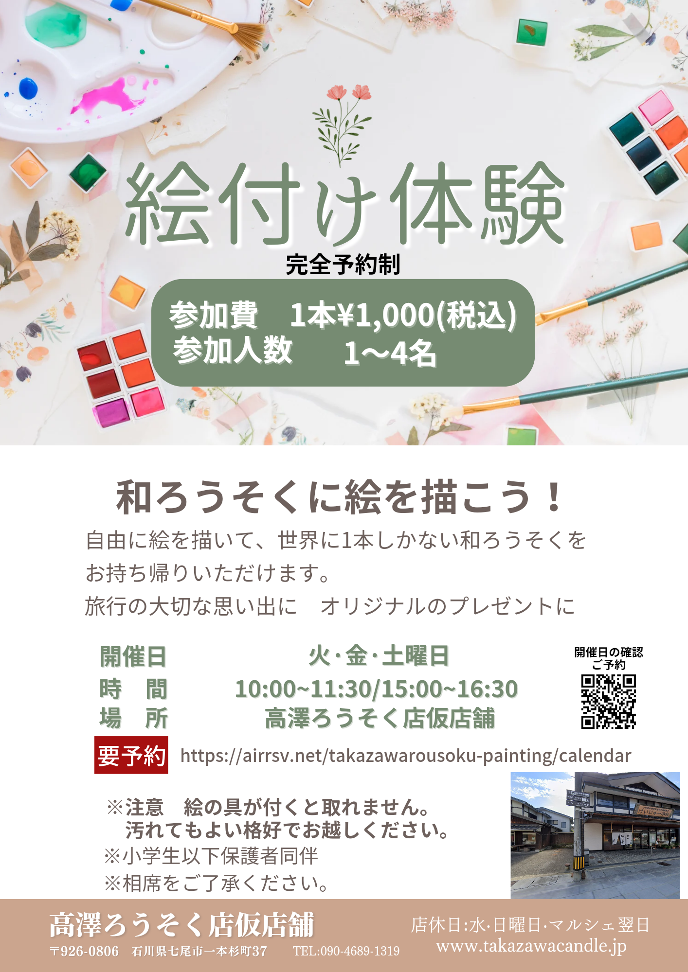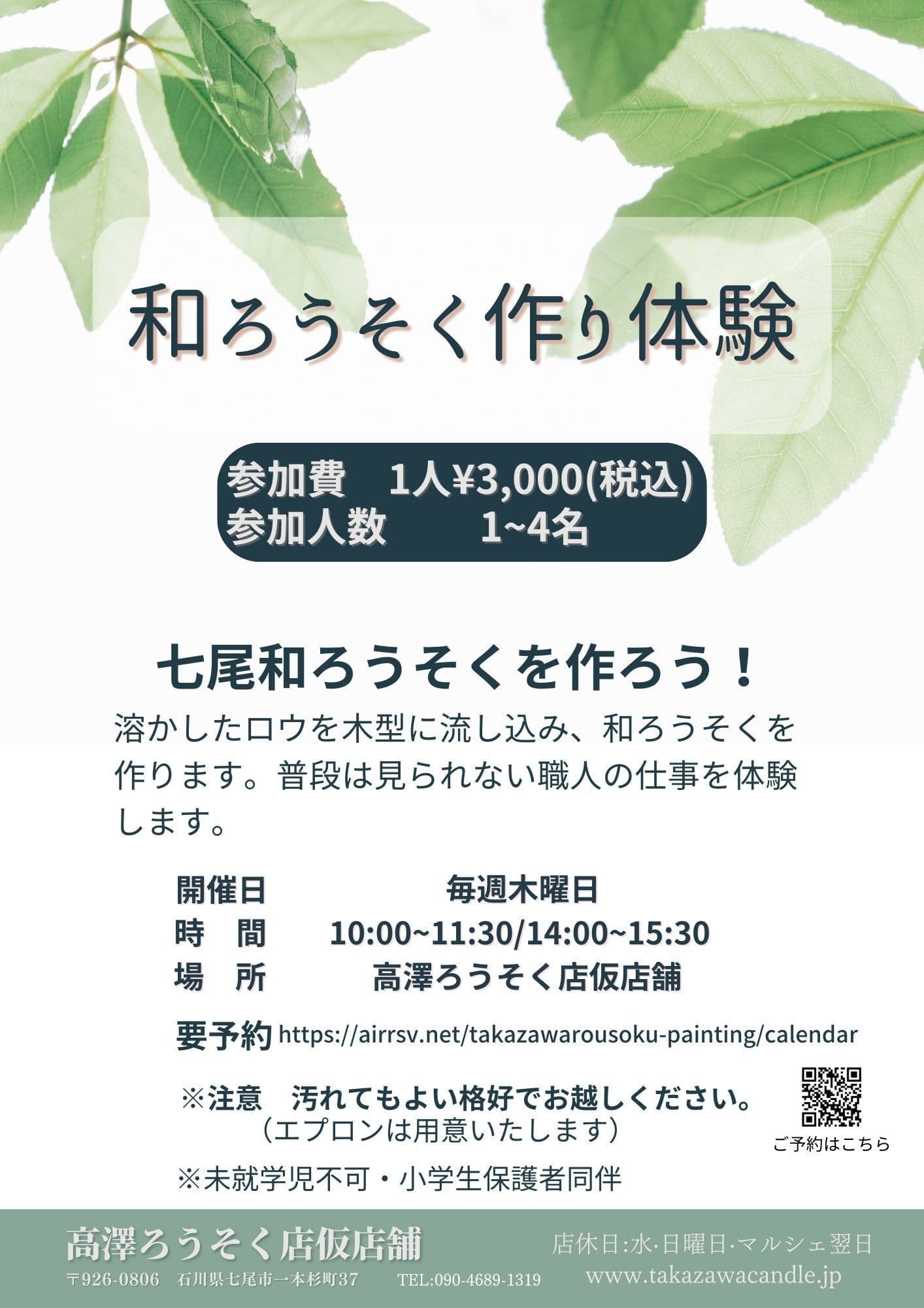 仮店舗にて七尾和ろうそく作りとろうそく絵付けの2つの体験イベントをはじめます。